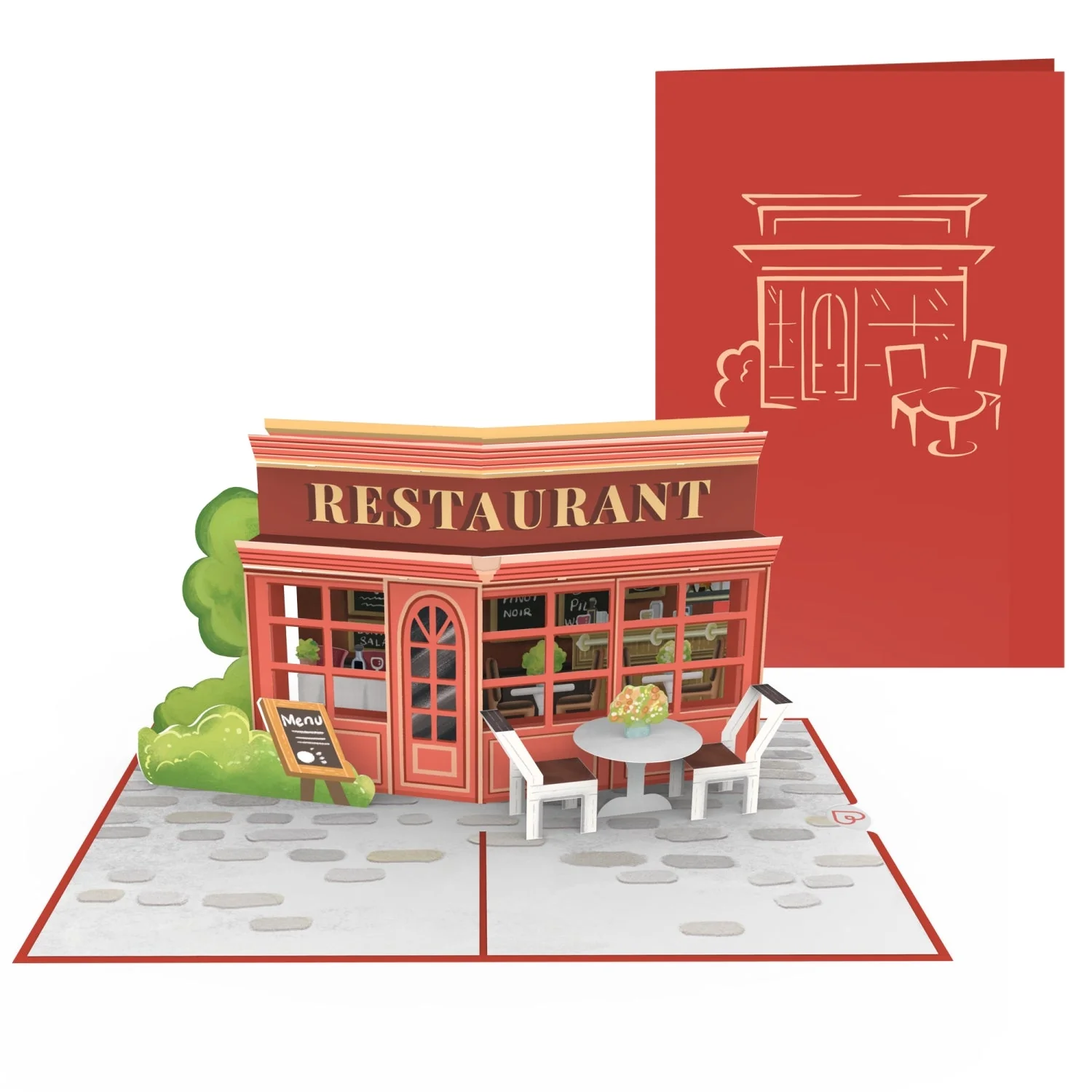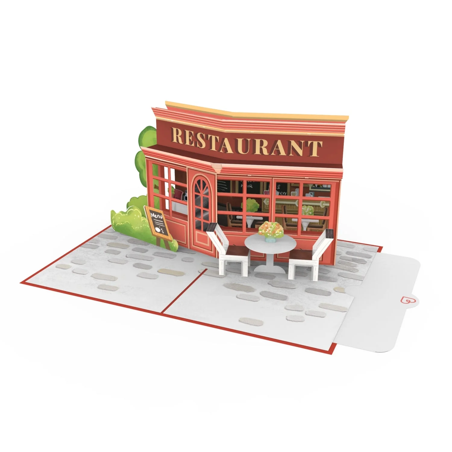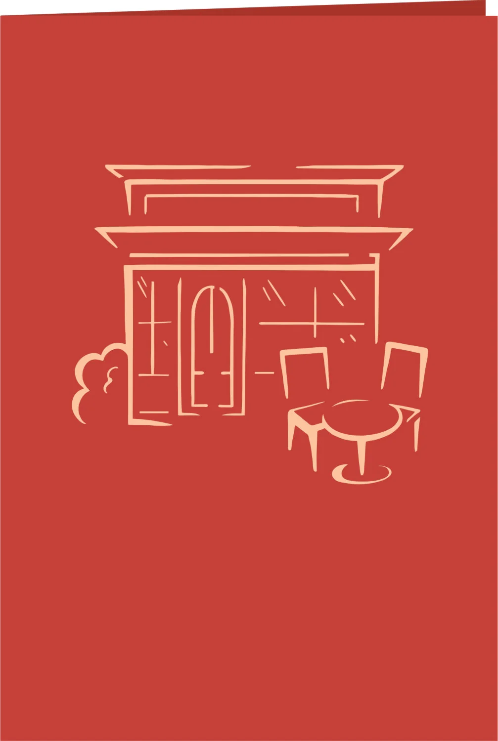 Bon Appétit! Beim Öffnen dieser originellen Grußkarte entfaltet sich ein kleines, filigranes, französisches Restaurant – ganz aus Papier. In dem gemütlichen Restaurant ist schon alles für die Gäste vorbereitet: Das Menü ist angeschlagen und die Tische sind eingedeckt. Auch draußen wurden zwei Stühle und ein Tisch mit Blumen bereitgestellt – jetzt fehlen nur noch die hungrigen Gäste!